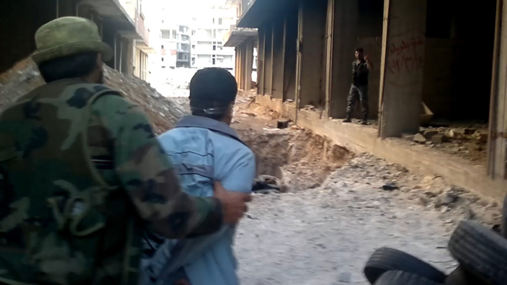 Empezamos con el propio vídeo de la ejecución principal. Y había una buena pista sobre el momento preciso de la masacre, ya que uno de los archivos de vídeo tenía una marca de tiempo del 16-4-2013. Localizar el lugar exacto de los asesinatos fue más difícil: la fosa común estaba excavada en una calle bastante estrecha, y la arquitectura y el diseño urbano sugerían que estaba en algún lugar de los suburbios de Damasco, pero no estaba claro si era en Ghuta oriental o en los distritos del sur. Vimos poco más que el edificio situado justo enfrente de la fosa de ejecución tenía un balcón azul y un tejado rojo, y una pared tenía ilustraciones de palmeras. Por lo demás, toda la zona estaba bombardeada y no había nada reconocible: No se veía ninguna tienda, señal o punto de referencia. Pero después de ver el vídeo una y otra vez, nos dimos cuenta de que había un grafiti en una de las paredes detrás del perpetrador: «Conquista de la ciudad de Yalda, 14/3/2012». Este texto, pintado con aerosol muy probablemente por las facciones rebeldes, sugería que el lugar podría haber sido la ciudad sureña de Yalda, que cayó en manos de los rebeldes brevemente en 2012. (Resultó ser el vecino barrio obrero de Tadamón, pero la pista era un comienzo). Las pintadas nos llevaron a ponernos en contacto con activistas de la oposición y facciones rebeldes que habían actuado allí.