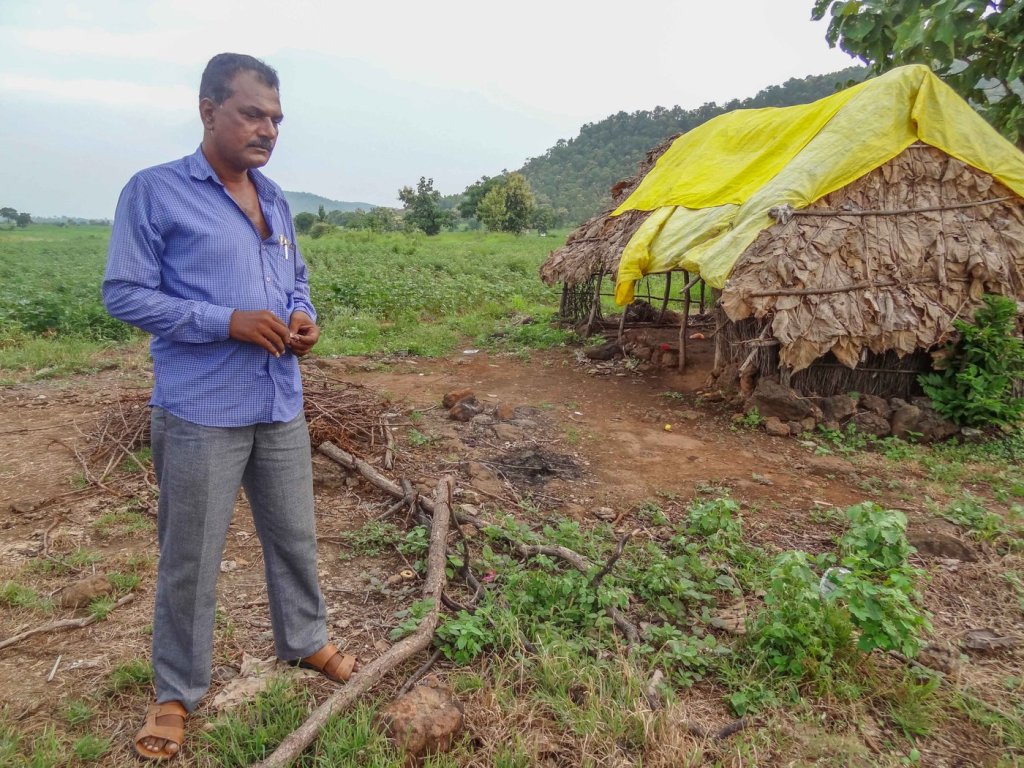 El toldo de paja de Champat -construido para protegerse del sol y la lluvia cuando pasaba días y noches vigilando su granja contra los jabalíes- sigue en pie en este paisaje salpicado de rocas. Sus vecinos recuerdan que siempre estaba allí, cuidando su granja.