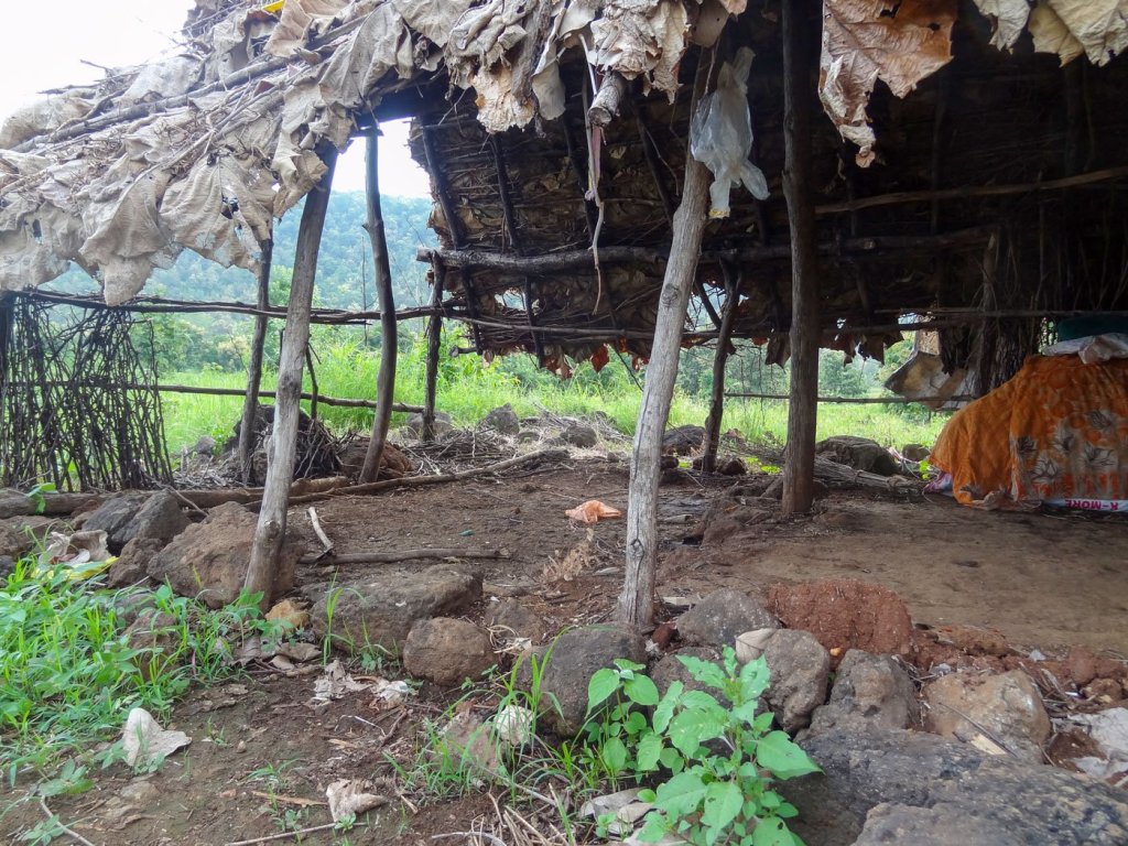 El pequeño toldo de paja que Champat había construido para sí mismo en su granja aparece desierto.