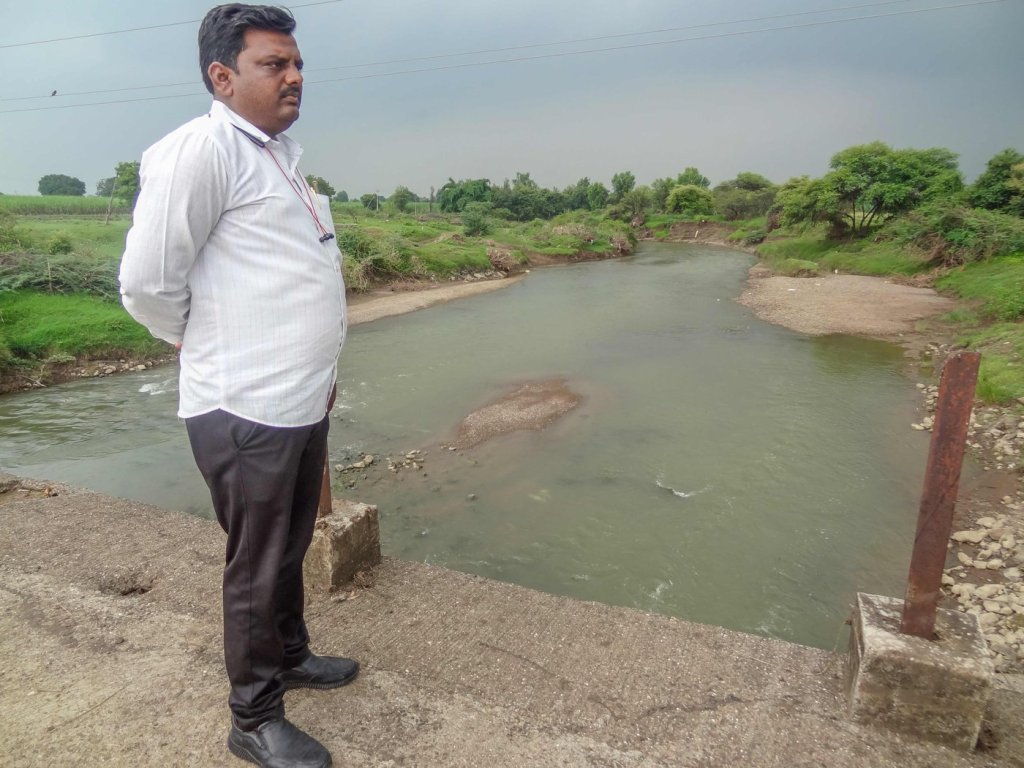 Punjab Rajegore, sarpanch de Shelgaon en Nanded, de pie en el puente del río Uma que quedó sumergido en las inundaciones repentinas de julio.