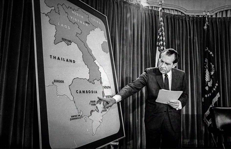Descubierto por Radio Hanoi de Vietnam del Norte y confirmado por el New York Times en mayo de 1969, el bombardeo secreto de Camboya fue oficialmente negado y desconocido por el público y los comités pertinentes del Congreso en ese momento. Se ocultó tanto al Congreso y al pueblo estadounidense que el 30 de abril de 1970, al anunciar la primera invasión terrestre de Camboya declarada públicamente por Estados Unidos para atacar presuntas bases enemigas, Nixon mintió descaradamente al decir al país: «Durante cinco años ni Estados Unidos ni Vietnam del Sur se han movido contra estos santuarios enemigos porque no deseábamos violar el territorio de una nación neutral».