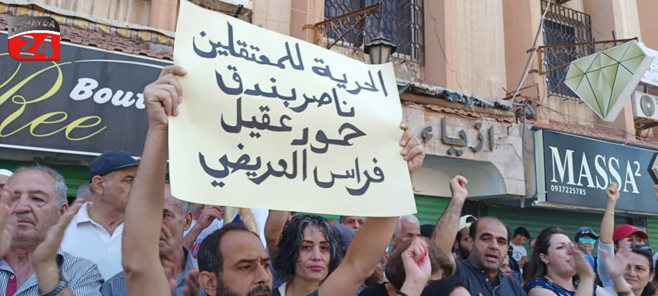 Manifestantes en Swaida pidiendo la liberación de los detenidos, sábado 26 de agosto de 2023. (Foto: Suwayda24)