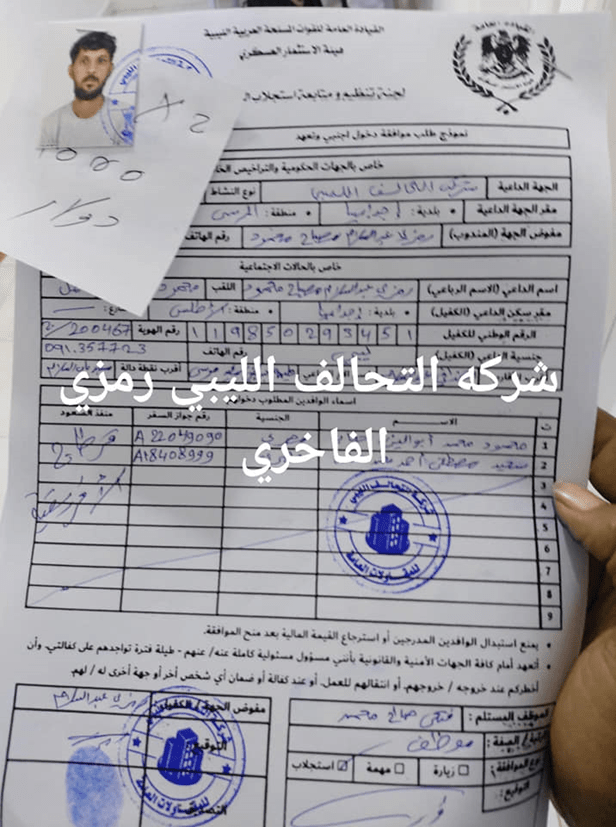 Copia cumplimentada del formulario de autorización de seguridad de dos ciudadanos egipcios presentado a la Autoridad Militar de Inversiones de Libia. Una nota recortada en el formulario dice «1000 dólares»[ARIJ].