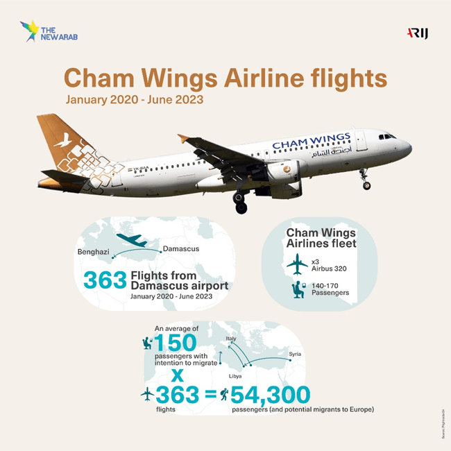 El 19 de abril de 2023, el miembro del Parlamento Europeo Cyrus Engerer envió una carta de solicitud de investigación a la Comisión Europea bajo este epígrafe: «Cham Wings fleta vuelos para introducir clandestinamente a ciudadanos de Bangladesh en Europa a través de Libia”. La carta indicaba que un gran número de nacionales de Bangladesh «entraban irregularmente en Europa por la ruta del Mediterráneo central […] y que la Agencia Europea de la Guardia de Fronteras y Costas (Frontex) había informado de un aumento del 51% de llegadas irregulares por esta ruta el año pasado». Con sólo tres aviones, la aerolínea organiza dos, a veces tres, vuelos semanales de Beirut a Damasco y luego a Bengasi, según Flightradar24.