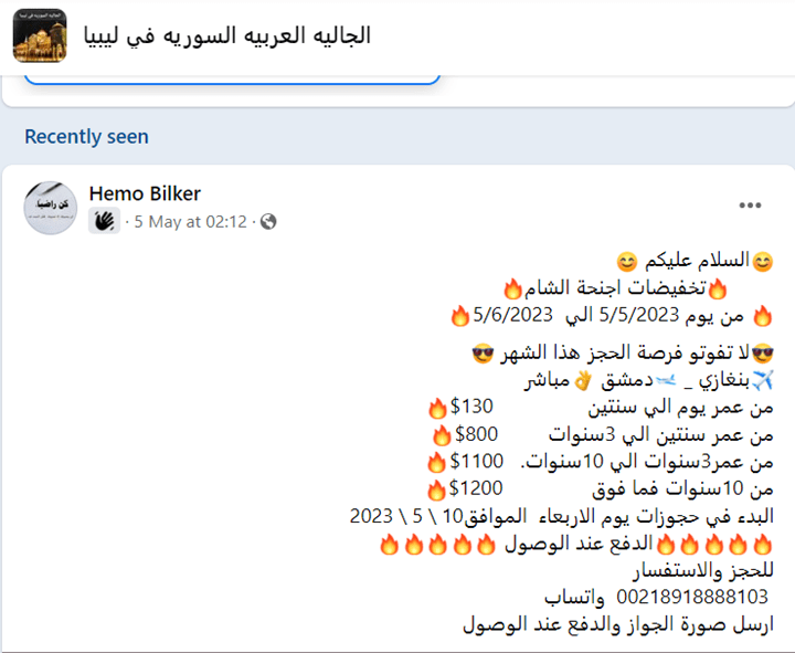 Los anuncios para viajar de Damasco, Beirut o Erbil a Bengasi abundan en las redes sociales. Encontramos varias páginas de Facebook de particulares, agencias de viajes y contrabandistas que promocionaban viajes a Bengasi, junto con garantías de proporcionar la autorización de seguridad necesaria y el servicio de recogida en el aeropuerto de Benina.