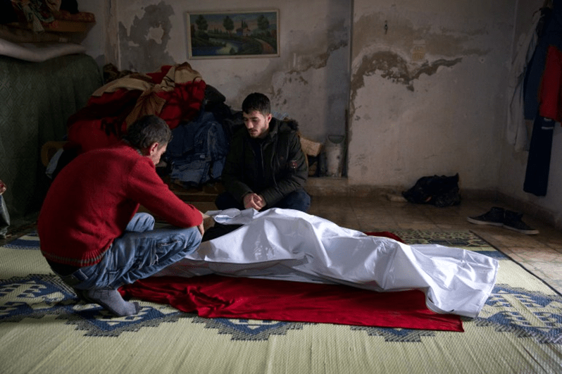 Foto de portada: Un hombre se muestra sobrecogido al ver la sangre de un pariente anciano, asesinado mientras llevaba el desayuno a casa durante el bombardeo del 1 de enero contra Darat Izza, en la campiña occidental de Alepo [Ali Haj Suleiman/Al Jazeera].