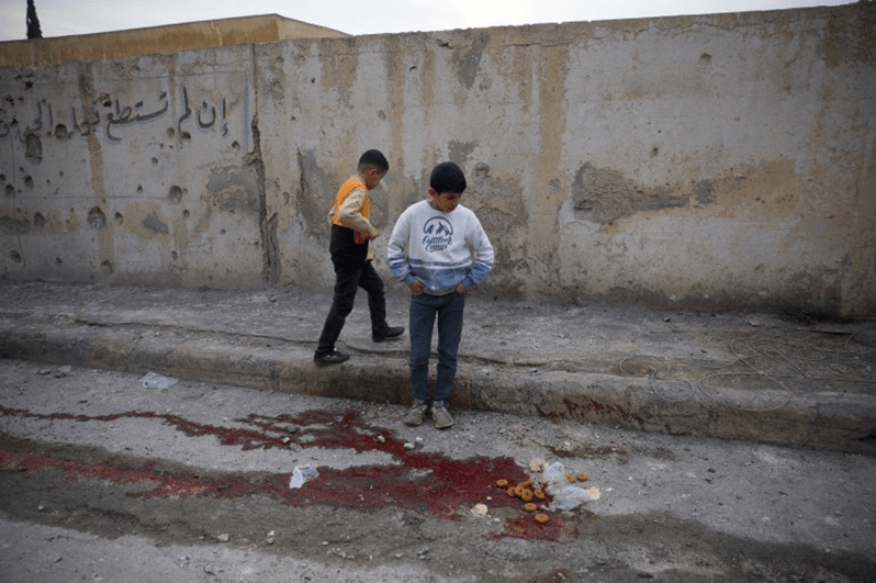 Dos niños miran la sangre y unos dulces caídos en el suelo, lo único que queda de un hombre que volvía a casa con el desayuno para su familia y murió a causa de una bomba en Darat Izza, noroeste de Siria [Ali Haj Suleiman/Al Jazeera].