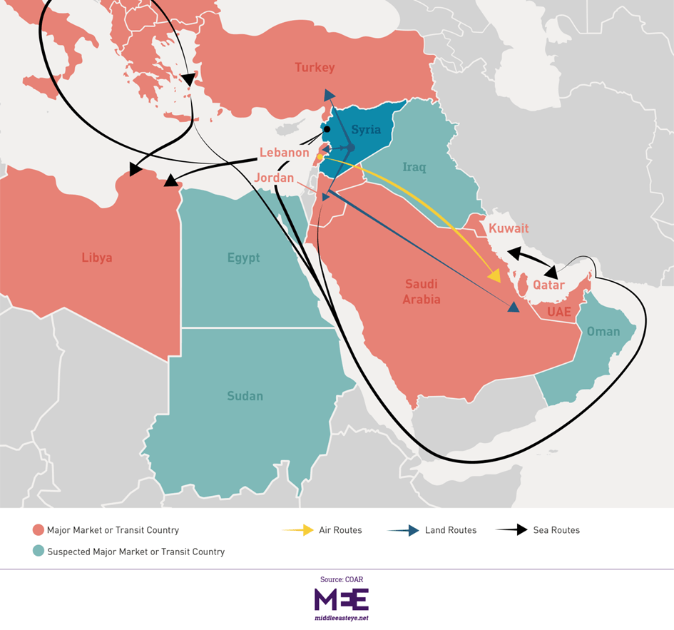 De hecho, la cuestión de las drogas ha deteriorado las relaciones de Jordania con el gobierno sirio. Jordania ha lanzado recientemente varios ataques aéreos contra aldeas sirias, citándolas como centros de producción de drogas.