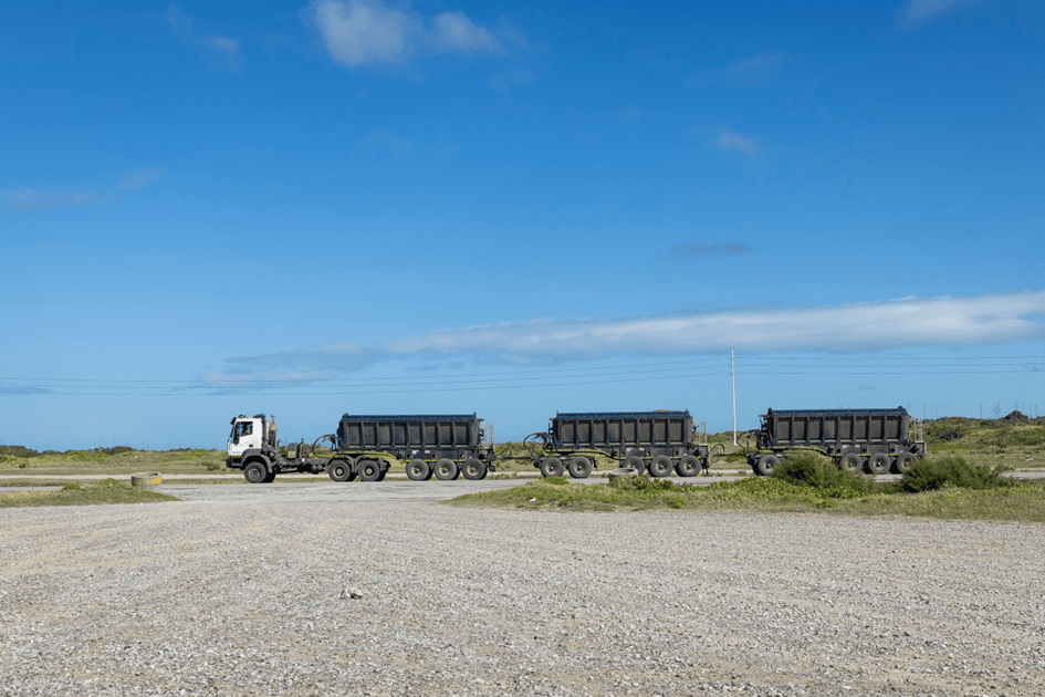 Un camión perteneciente a QMM transporta minerales al Port d’Ehoala en Fort Dauphin, Madagascar, el 8 de julio de 2023. Foto: Patrick Meinhardt para The Intercept
