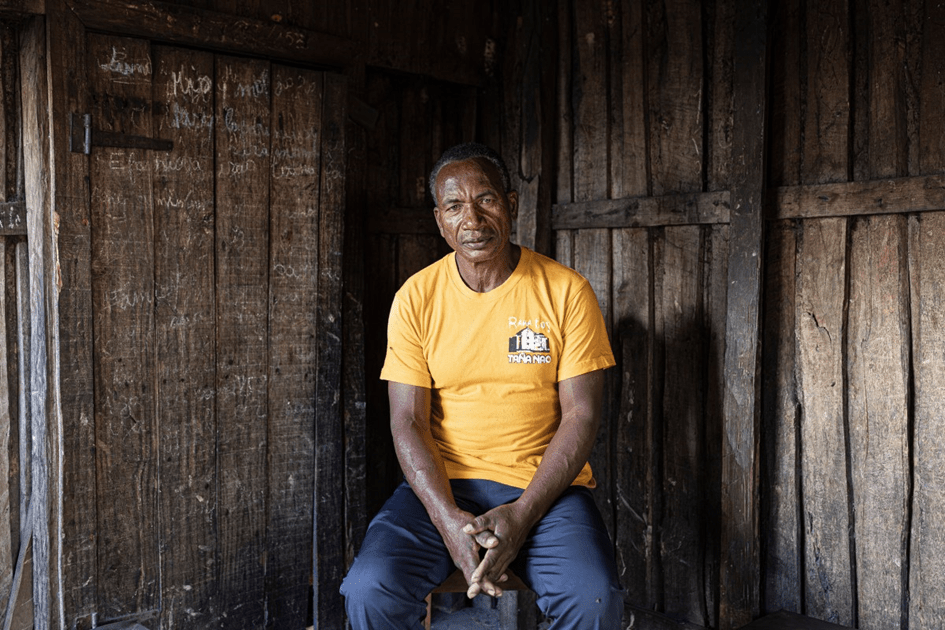 Mbola Jeannot, de 57 años, posa para un retrato dentro de su casa en Ambinanibe, en Fort Dauphin, Madagascar, el 12 de julio de 2023. Era propietario de un terreno donde ahora se encuentra el puerto de QMM. Foto: Patrick Meinhardt para The Intercept