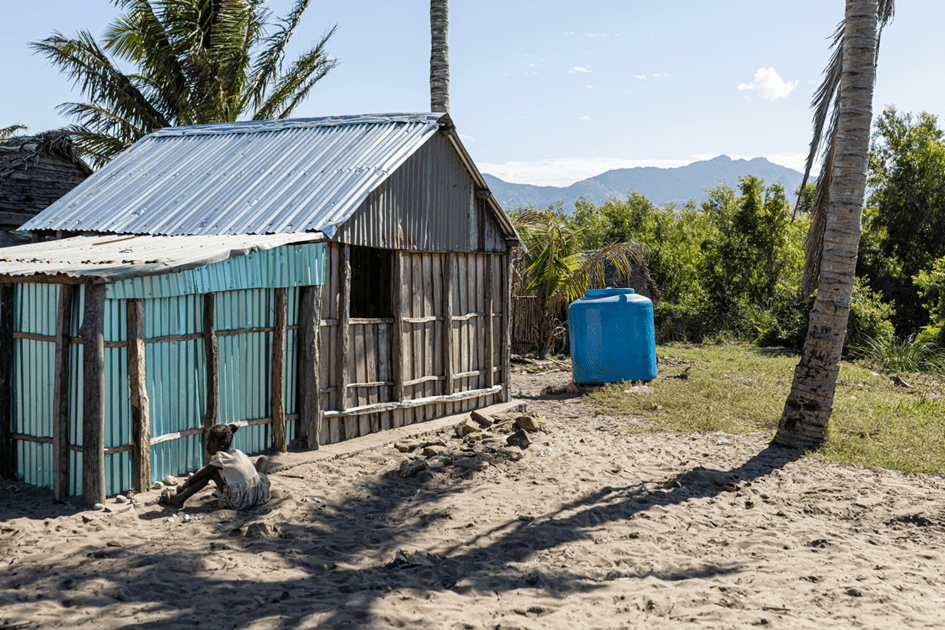Una niña juega junto a un tanque de agua suministrado por Rio Tinto a la aldea de Emanakana, a orillas del lago Lanirano, en Fort Dauphin, Madagascar, el 9 de julio de 2023. Los empleados vienen varias veces a la semana para llenar los tanques desde que se disuadió a la gente de beber agua de los lagos. Foto: Patrick Meinhardt para The Intercept