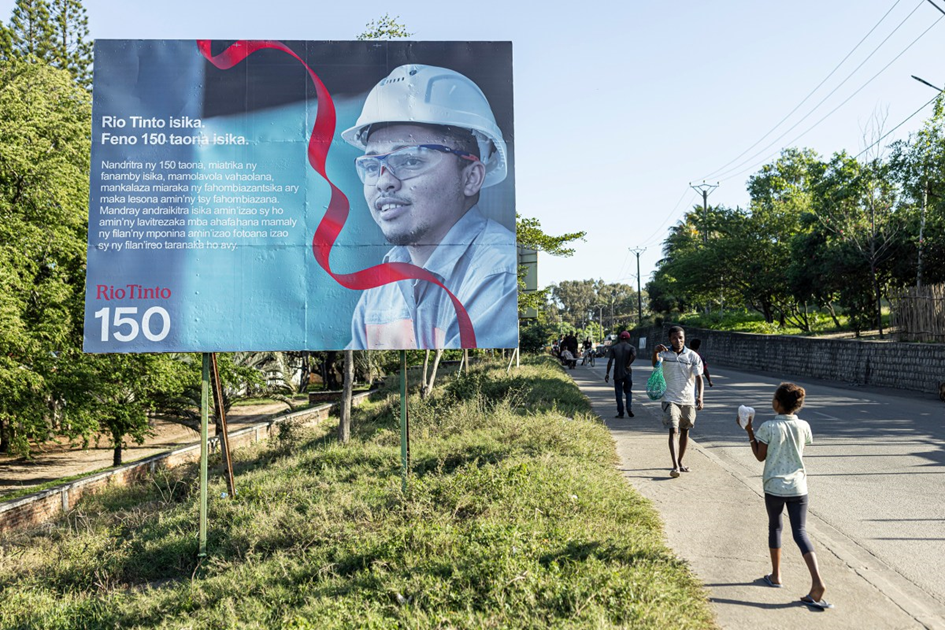 Cartel que celebra los 150 años de Rio Tinto en Fort Dauphin, Madagascar, el 8 de julio de 2023. Foto: Patrick Meinhardt para The Intercept