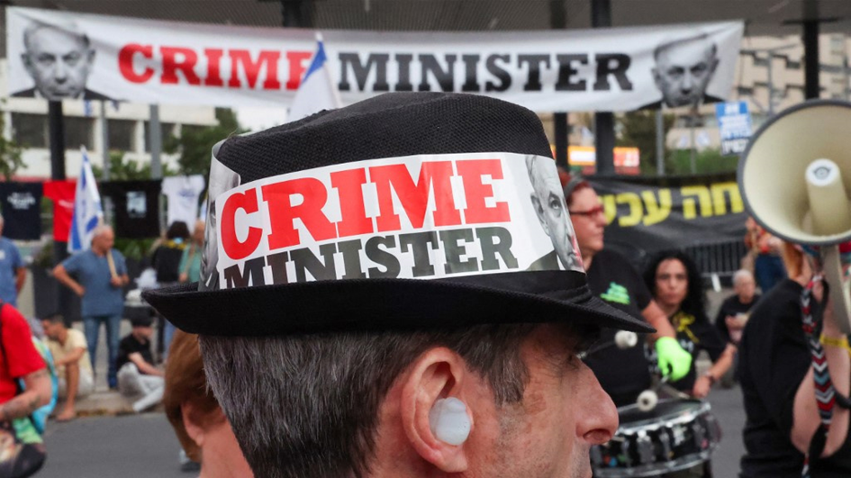 Un manifestante israelí con una gorra con un lema contra el primer ministro israelí Benjamin Netanyahu es fotografiado en Tel Aviv, el 27 de abril de 2024 (Jack Guez/AFP)