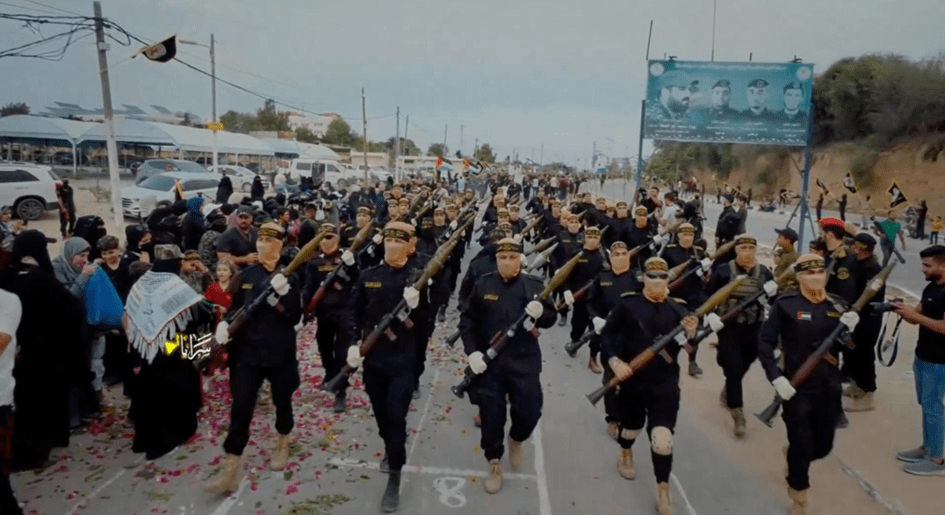 Captura de pantalla de un vídeo de Al Quds de un desfile en la ciudad de Gaza para conmemorar el 36.º aniversario de la fundación de la Yihad Islámica Palestina, el 4 de octubre de 2023.