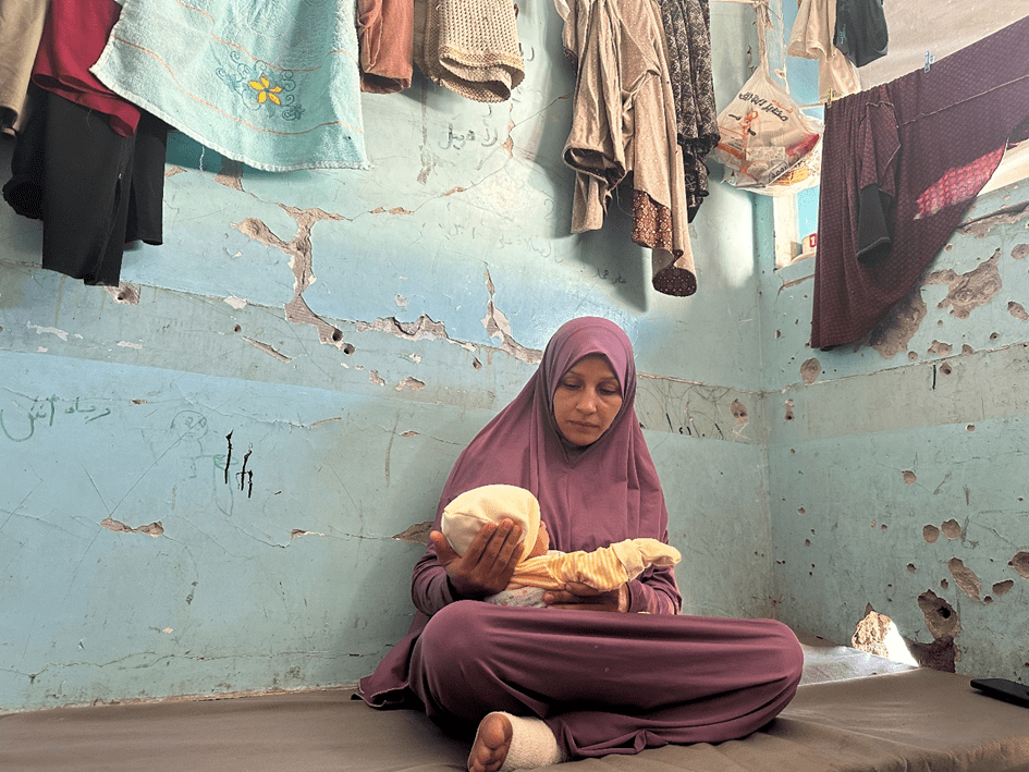 Amal Almasri acuna a su hija recién nacida, Somod, en un rincón de un aula de una escuela del oeste de la ciudad de Gaza donde se refugia su familia, el 5 de noviembre de 2024. Foto: Ahmed Dremly.