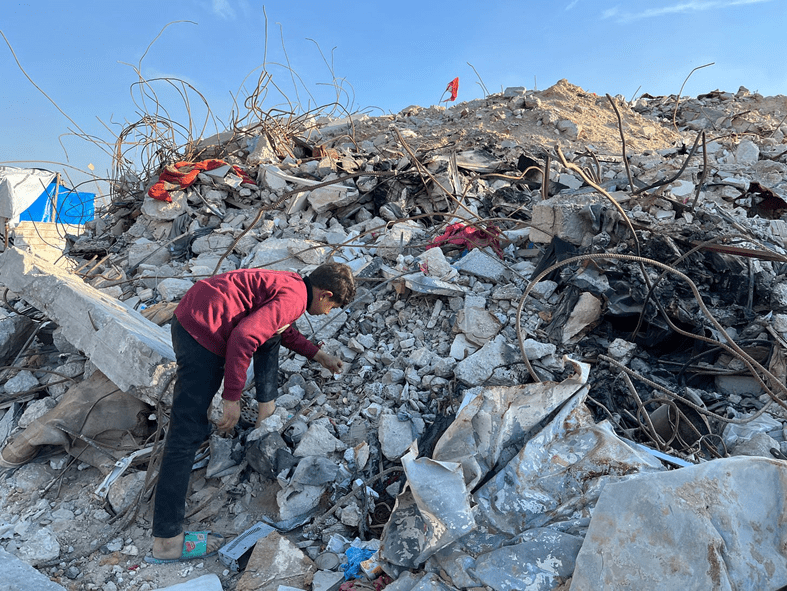 «Ahora vivimos en las mismas condiciones aterradoras. Lo que es diferente es que nuestra tienda está ahora sobre los escombros de nuestra casa. Llevamos dos semanas removiendo escombros y aún no hemos terminado. Sabemos que puede caerse en cualquier momento, pero no podemos hacer nada porque no tenemos ninguna solución a nuestro alcance», explica.