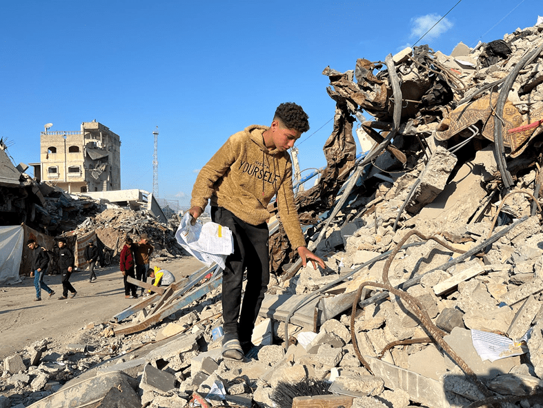 Cuando por fin llegué a la ciudad de Gaza, a la zona de Sheij Ejlin, cerca de la carretera de la costa, mi pelo y mis cejas se habían vuelto grises por el polvo. Ante mí no había más que montones de hormigón roto. La gente rebuscaba entre los escombros, buscando cualquier cosa que pudiera encontrar. Los pintorescos edificios y cafés de la costa a los que solía ir ya no existen, simplemente han desaparecido. La Universidad de Al-Aqsa, donde debería haberme graduado en 2024, yacía en ruinas. Sólo quedaban algunos libros arrancados y sillas rotas. Los edificios que seguían en pie estaban quemados y parcialmente destruidos, con frágiles cimientos. No había luz en ninguna parte.