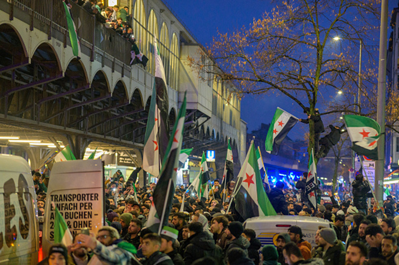 Un grupo de personas celebrando la caída del régimen de Bashar al-Asad en Berlín, Alemania, el 8 de diciembre de 2024. [GETTY]