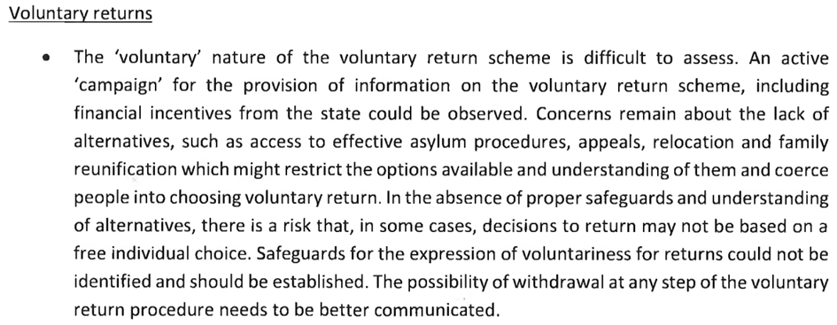 A partir de abril de 2022, los observadores de los derechos fundamentales de Frontex denunciaron múltiples casos de solicitantes de asilo «presionados» para participar en retornos voluntarios, que recibían información engañosa sobre la situación en su país de retorno y a los que se decía que sus solicitudes de asilo no tenían posibilidades de prosperar.