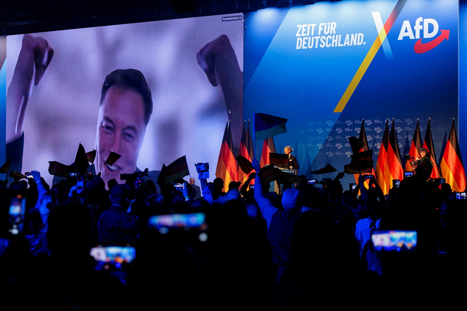 Elon Musk en una gran pantalla mientras Alice Weidel, colíder de AfD, se dirige a un mitin de la campaña electoral en Halle, este de Alemania, el 25 de enero de 2025. Foto de AFP vía Getty Images.