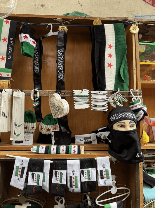 Más allá de las imágenes patrocinadas por el Estado, el concepto de masculinidad enmascarada también se ha arraigado y normalizado culturalmente en la sociedad siria, sobre todo a través de símbolos asociados a la lucha revolucionaria. La imagen de arriba ilustra claramente este fenómeno: mercancía adornada con la bandera revolucionaria siria junto a cintas para la cabeza con lemas y máscaras que recuerdan la iconografía militante.
