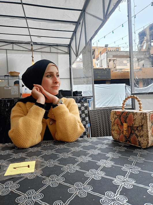 La periodista Rasha Abou Jalal sentada en el restaurante Thai días antes de que fuera bombardeado por el ejército israelí. Mayo de 2025. (Foto cortesía de Rasha Abou Jalal)