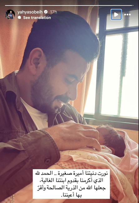 El periodista Yahya Sobeih acuna a su hija recién nacida horas antes de morir en un ataque aéreo contra un restaurante tailandés en la ciudad de Gaza, 7 de mayo de 2025. (Foto: captura de pantalla de Instagram @yahyasobeih)