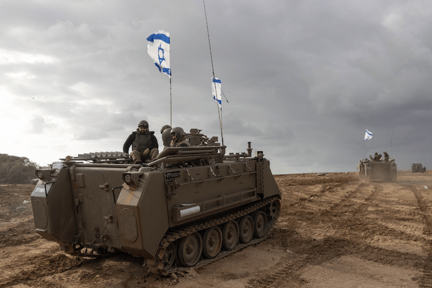 Un convoy de vehículos blindados de transporte de personal visto cerca de la valla fronteriza entre Israel y Gaza, 20 de noviembre de 2023. (Chaim Goldberg/Flash90)