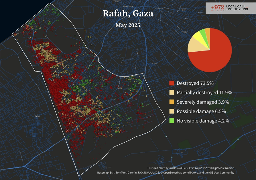 En diciembre de 2024, la ONU estimó que el 69% de todos los edificios de la Franja de Gaza, incluidas 245.000 viviendas, habían resultado dañados, con más de 60.000 edificios completamente destruidos. A finales de febrero, esa cifra ascendía a 70.000, según Adi Ben Nun, especialista en SIG de la Universidad Hebrea de Jerusalén, quien realizó un análisis satelital para +972 y Local Call. Al menos 2.000 estructuras adicionales fueron destruidas en marzo, más de 1.000 de ellas sólo en Rafah.