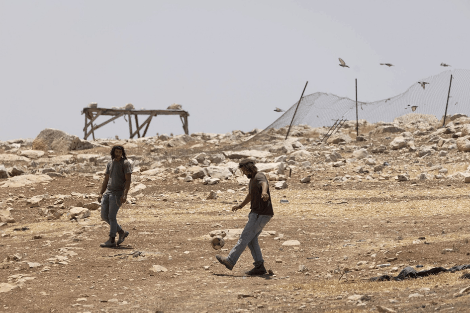 Colonos jugando con un balón de fútbol que encontraron en Maghayer Al-Dir, 22 de mayo de 2025. (Oren Ziv)