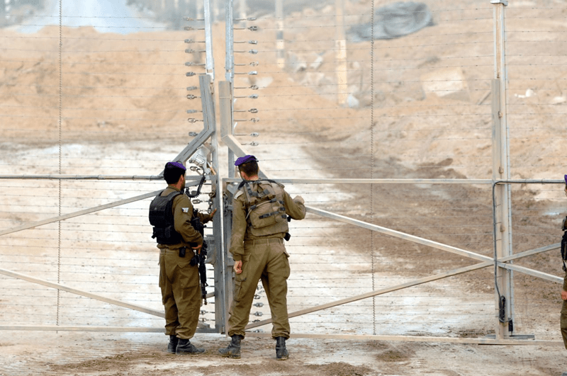 Soldados israelíes cierran la puerta del paso fronterizo de Kissufim hacia el centro de Gaza después de que las últimas tropas abandonaran el bloque de asentamientos de Gush Katif, el 12 de septiembre de 2005. (Moshe Milner/GPO)