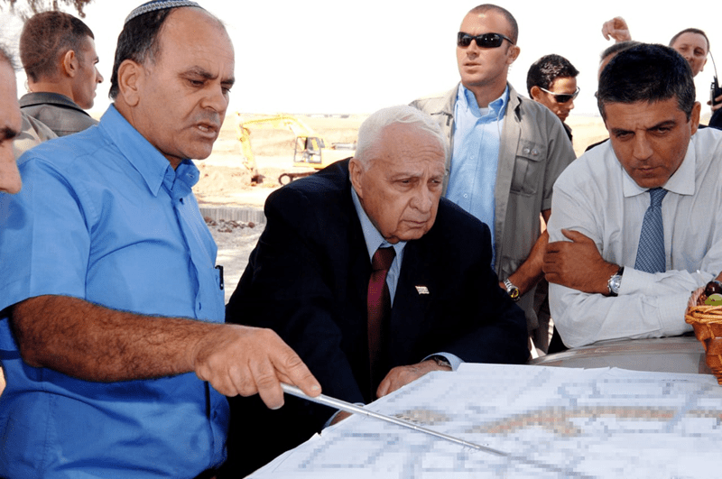 El primer ministro israelí Ariel Sharon recorre la zona de Yad Binyamin, en el centro de Israel, destinada a absorber a los colonos agricultores reubicados desde la Franja de Gaza, el 5 de julio de 2005. (Amos Ben Gershom/GPO)