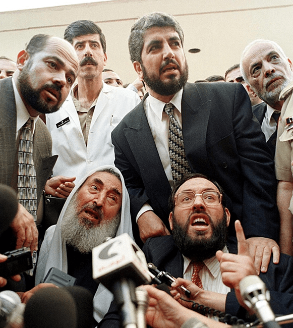 Mohammad Nazzal, a la derecha, habla con periodistas en Amán, Jordania, el 6 de octubre de 1997. A su izquierda se encuentra el fundador y líder espiritual de Hamás, el jeque Ahmed Yassin, asesinado por Israel en 2004. Detrás de ellos se encuentran los altos dirigentes de Hamás Musa Abu Marzuk, Khaled Meshaal e Ibrahim Ghosheh. (Foto de Jamal Nasrallah/AFP vía Getty Images)
