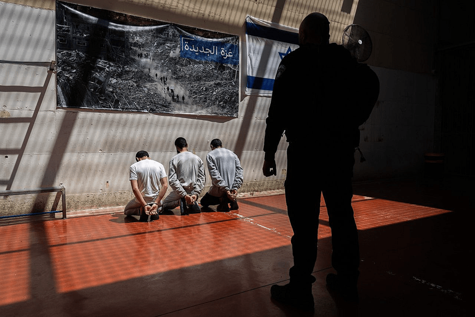 Palestinos esposados son obligados a sentarse frente a una imagen de la destrucción causada por la ofensiva israelí en la Franja de Gaza y una bandera israelí, en una prisión del centro de Israel, el 6 de mayo de 2025. (Chaim Goldberg/Flash90)