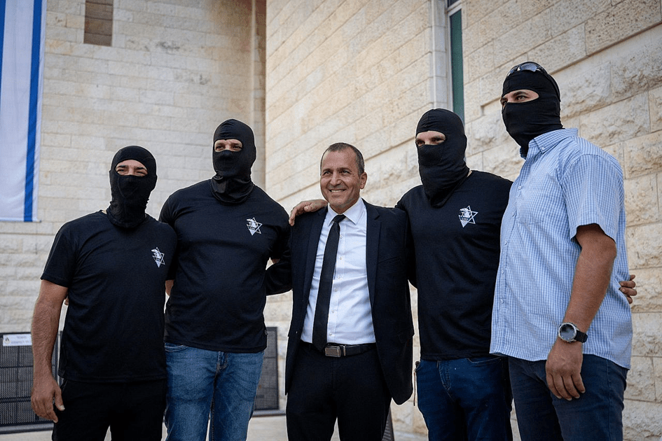 Guardias de prisiones israelíes, grabados en un video filtrado violando a un detenido palestino en el centro de detención de Sde Teiman, comparecen ante la prensa junto a su abogado tras la renuncia de la abogada general militar, la mayor general Yifat Tomer-Yerushalmi, frente al Tribunal Supremo de Jerusalén, el 2 de noviembre de 2025. (Yonatan Sindel/Flash90)