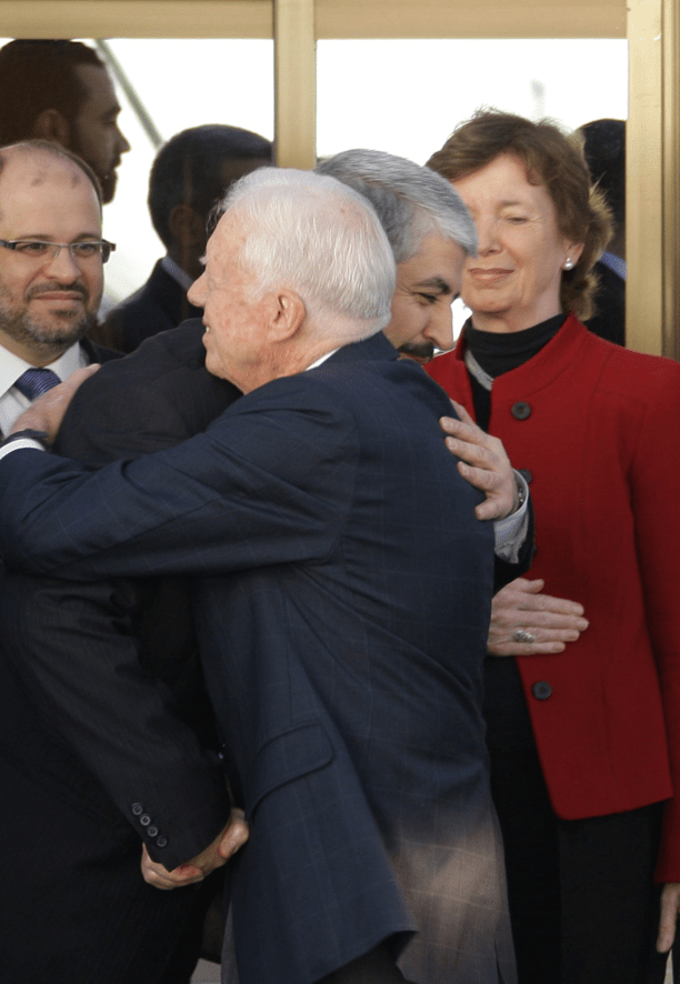 El expresidente estadounidense Jimmy Carter, a la derecha, abraza a Meshal a su llegada a Damasco para una reunión el 19 de octubre de 2010. Foto: AFP PHOTO/LOUAI BESHARA vía Getty Images.