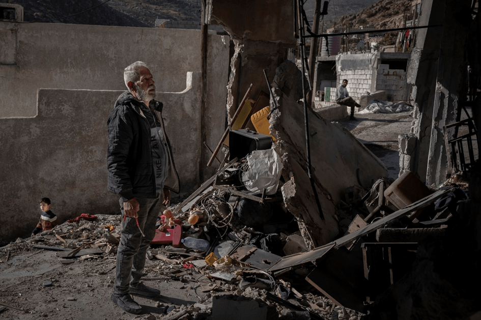 Abdo Qasem Hamada examina los restos de la casa familiar de su hijo tras el bombardeo de la aldea en la madrugada del 28 de noviembre de 2025, en Beit Yinn, Siria. (Santiago Montag)