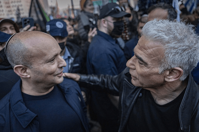 Las figuras de la oposición Naftali Bennett y Yair Lapid durante una marcha en apoyo al reclutamiento de judíos ultraortodoxos en el ejército israelí, Jerusalén, 15 de enero de 2026. (Yonatan Sindel/Flash90)