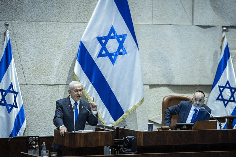 El primer ministro israelí, Benjamin Netanyahu, habla en el pleno del Knesset en Jerusalén, el 8 de diciembre de 2025. (Chaim Goldberg/Flash90)