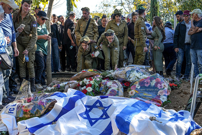 Familiares y amigos lloran en el funeral del soldado israelí Ron Sherman, secuestrado por Hamás el 7 de octubre y cuyo cuerpo fue recuperado durante una operación militar en la Franja de Gaza, en el cementerio de Lehavim, al sur de Israel, el 15 de diciembre de 2023. (Flash90)