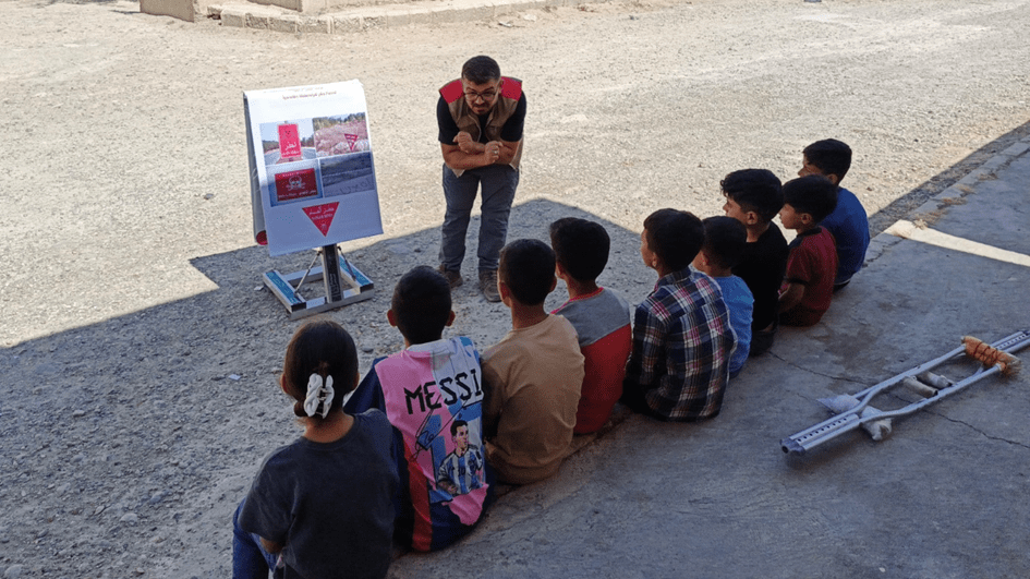 Un miembro del Mines Advisory Group imparte una clase de educación sobre los riesgos de los artefactos explosivos a niños en la aldea de Sabakh, en la provincia siria de Raqqa (MAG/MEE).