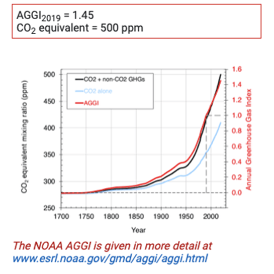El siguiente gráfico muestra la tendencia postindustrial de los gases de efecto invernadero, que son los principales impulsores del calentamiento global: cuanto más pronunciada y prolongada sea la curva, más se calentará la Tierra. El enfoque de la administración Trump en los combustibles fósiles a expensas de las energías renovables acentúa el ascenso vertical que eventualmente conducirá a un efecto invernadero global, a menos que se detenga y se elimine en cierta medida el CO2. La eliminación del CO2 de la atmósfera es extremadamente difícil, ya que la tecnología actual es insuficiente.