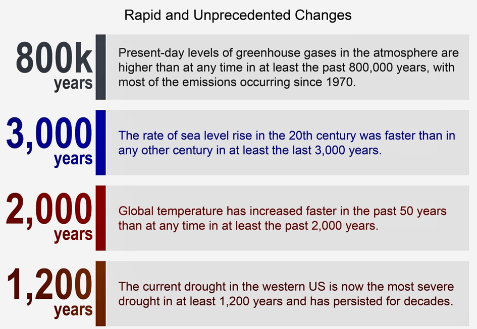 Las actividades humanas y, en particular, la industrialización han provocado en la atmósfera un aumento sin precedentes de las concentraciones de gases de efecto invernadero en registros que abarcan cientos de miles de años. Quinta Evaluación Nacional del Clima de EE. UU., 14 de noviembre de 2023:
