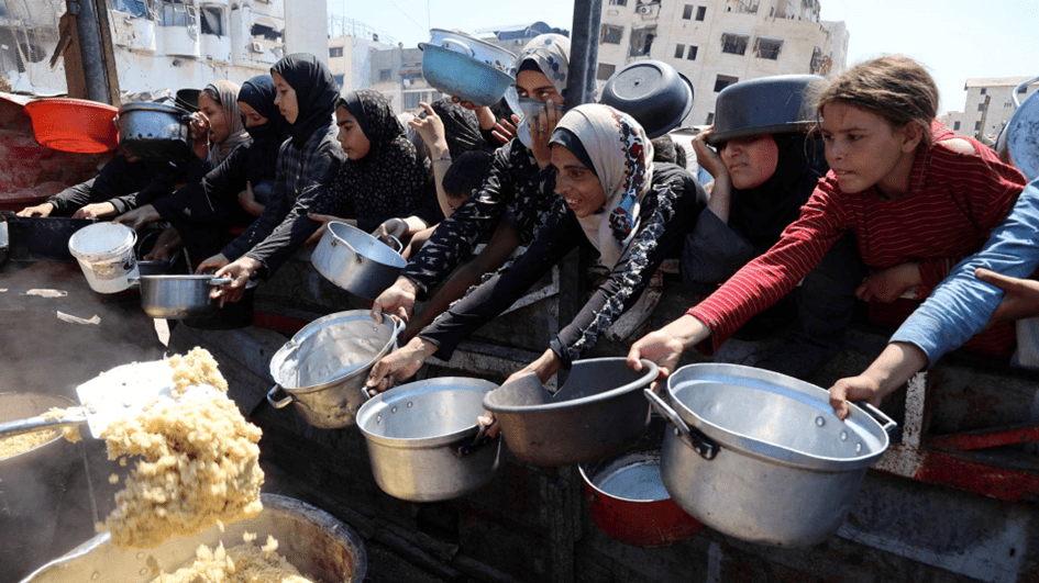 Mujeres y niñas palestinas extienden sus ollas vacías para recibir arroz cocido de un comedor social en la ciudad de Gaza el 23 de agosto de 2025 (AFP).