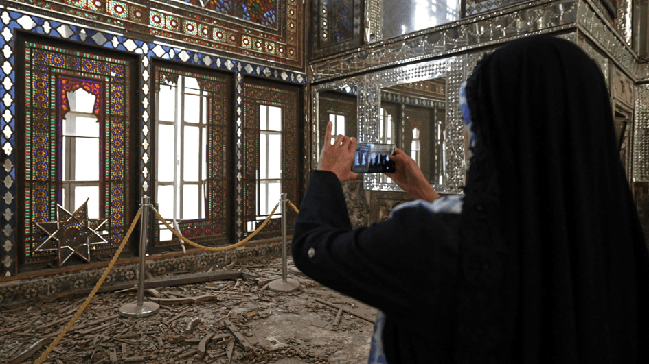 Una visitante toma fotografías del interior dañado del histórico Palacio de Golestán en Teherán, alcanzado por un ataque estadounidense-israelí el 4 de abril de 2026 (AFP).