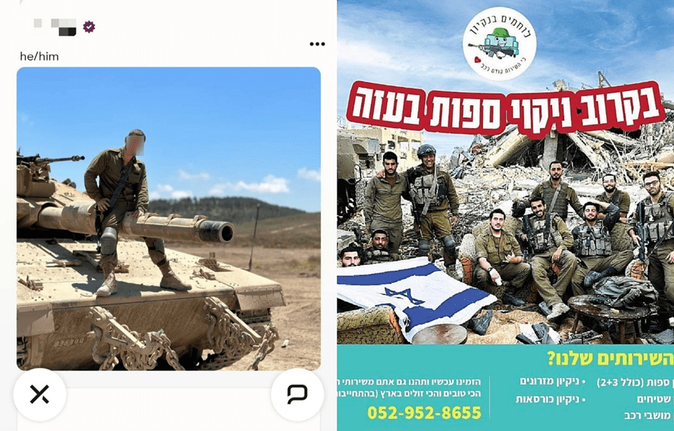 Izquierda: Foto del perfil de un soldado israelí en una aplicación de citas. (Captura de pantalla). Derecha: Un anuncio de la empresa de limpieza «Combatientes de la Limpieza», en el que aparecen soldados israelíes sentados en un entorno urbano devastado, probablemente en Gaza, con el título: «Próximamente, limpieza de sofás en Gaza». (Captura de pantalla)