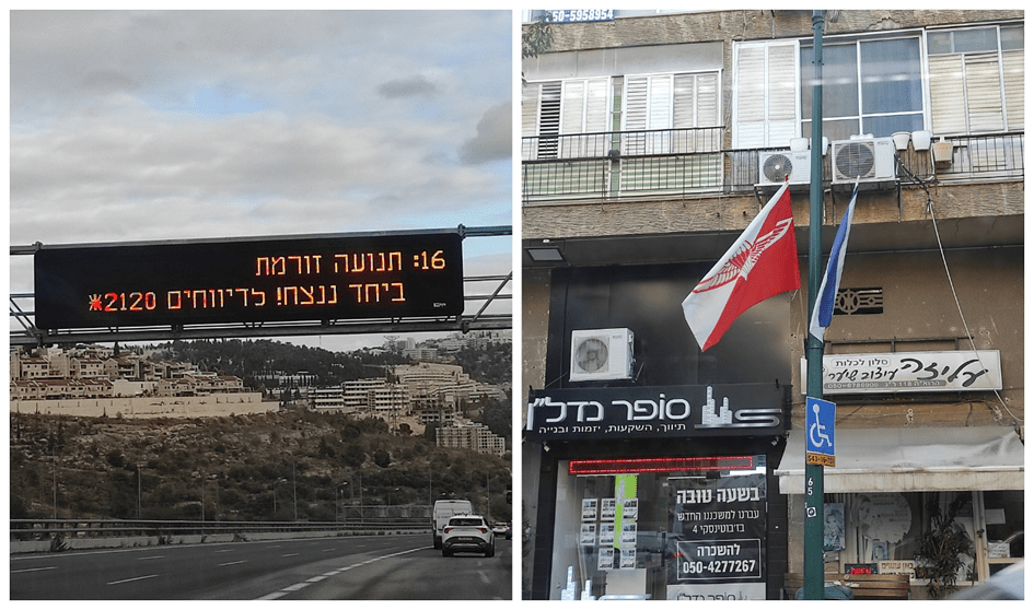 Izquierda: Señal de tráfico en una autopista israelí que reza: «Autopista 16: el tráfico fluye. ¡Juntos ganaremos!», 25 de noviembre de 2024 (Nissi Peli). Derecha: Banderas con la insignia de una unidad del ejército israelí instaladas por el ayuntamiento de Ramat Gan, 12 de noviembre de 2024. (Nissi Peli)