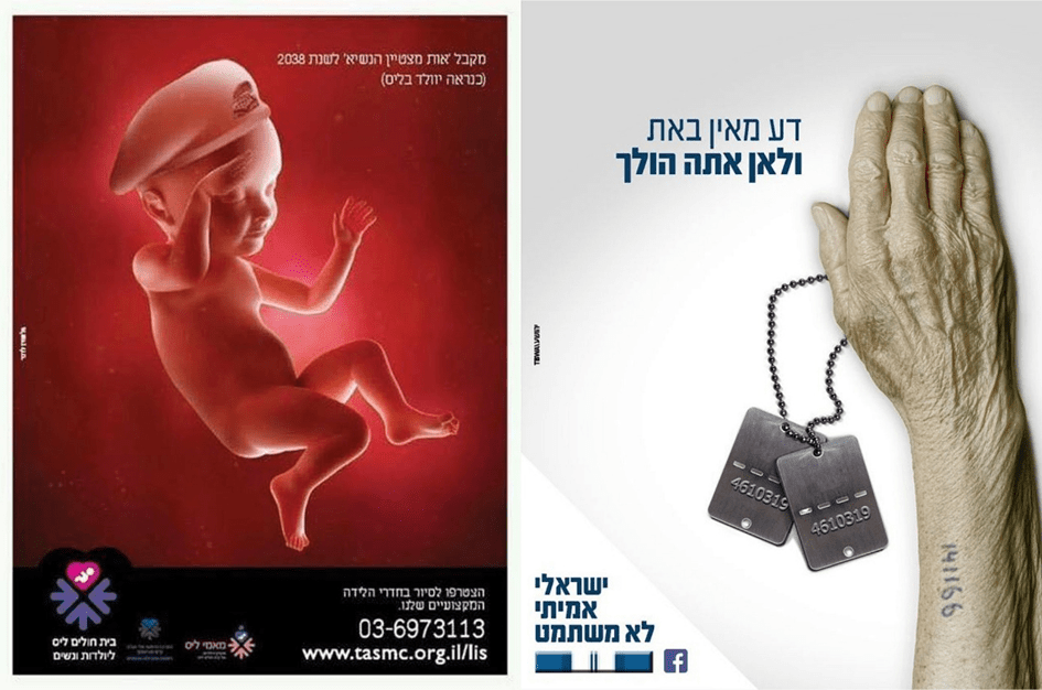 Izquierda: Anuncio de 2018 del Hospital Materno y de la Mujer Lis de Ichilov, en el que aparece la ilustración de un bebé haciendo el saludo militar con una boina del ejército, acompañada del texto: «Galardonado con el Premio Presidencial a la Excelencia del año 2038 (probablemente nacerá en Lis)». Este premio, uno de los honores militares más prestigiosos de Israel, se concede anualmente a 120 soldados de las FDI. (Captura de pantalla). Derecha: Campaña de 2022 de la organización sin ánimo de lucro «Un verdadero israelí no escapa». La palabra mishtamet (insumiso) tiene una connotación despectiva única en hebreo. El cartel de la campaña muestra la mano de una persona mayor marcada con un tatuaje de Auschwitz, agarrando una placa de identificación militar, junto al texto: «Sé de dónde vienes y adónde vas». (Captura de pantalla)